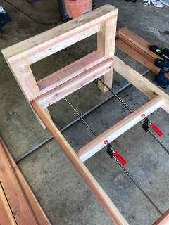 The bench is 6’ long 2’ deep, this worked perfect for my 2’x2’ cushions. I attached the bench to the right set of legs with the bench in the vertical position. I turned the bench to the horizontal position. Then I used my clamps to make sure the seat was level. Because I predrilled everything, it was pretty easy to connect. The final assembly was adding the back to bench. Because of the 6’ span, and I did not want any verticals. I turned one 2×4 to help the the stiffness and reduce sag. This also worked nice for back support.