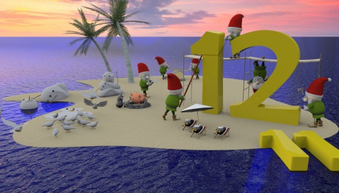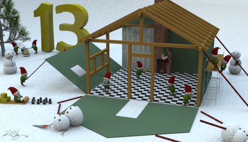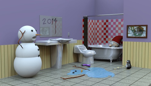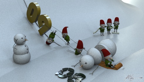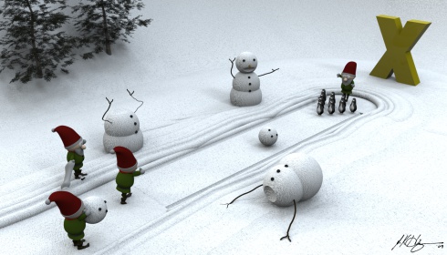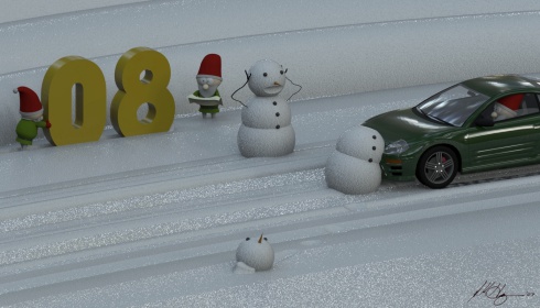 Well, it was fun for me. Prior to my digital art renderings of Elves vs Snowmen. David Marsee, one of the Principals at MPI, would do a hand sketch of Elves moving into the new year. He would have fun with it and show them caught in different situations. One year, while playing with some new rendering software, I did a funny image for myself. David saw it and suggested I develop it for the News Years’ card.